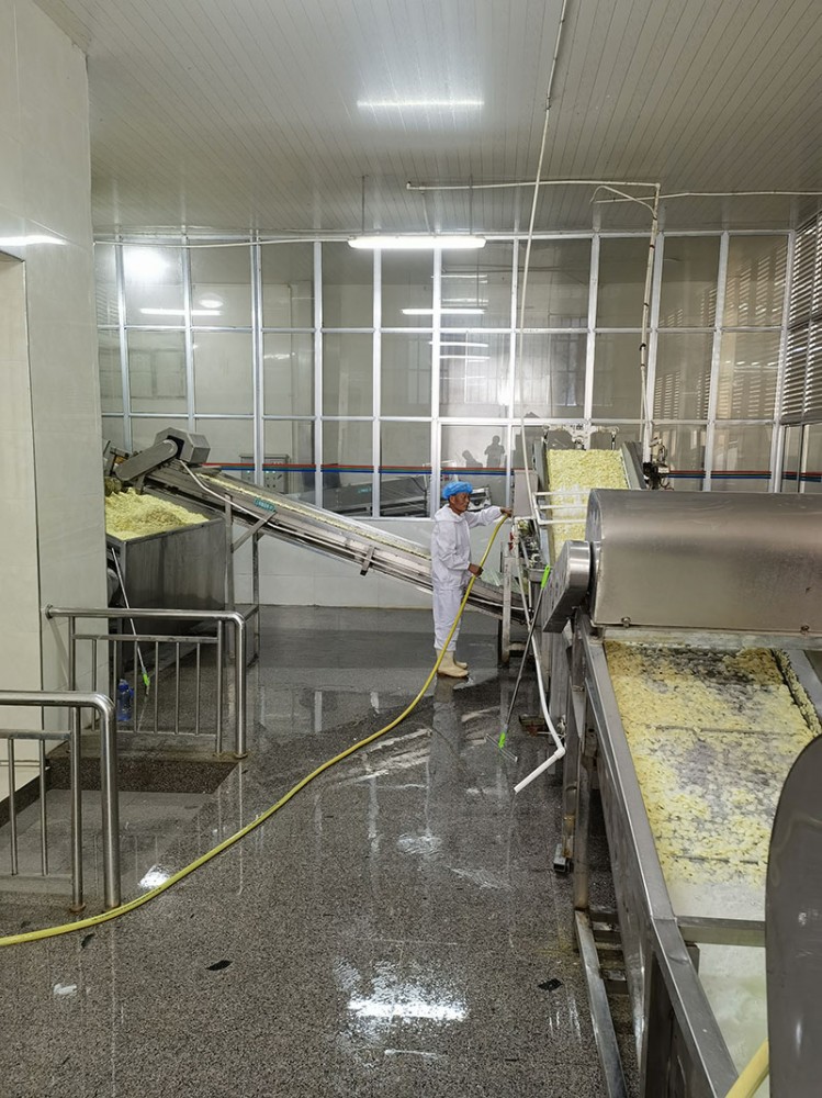 再漂洗:將切好的蒜片隨即導(dǎo)入竹筐內(nèi),在流動(dòng)的清水中充分漂洗,出去膠液和碎片,以利于烘制。漂洗不充分烘干時(shí)會(huì)造成黃褐色。